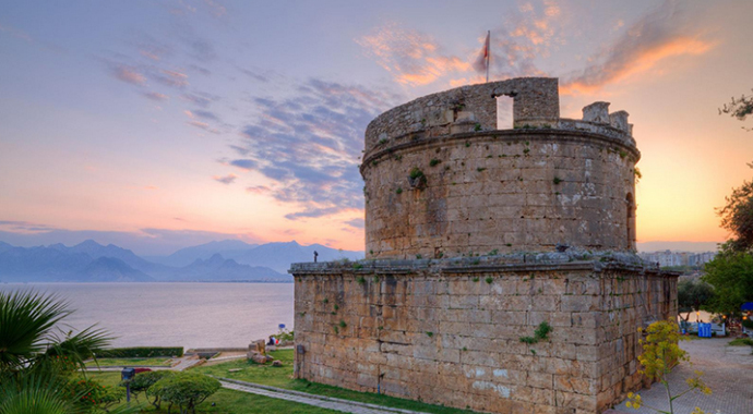 Она стоит на южной окраине старого города, у подножия парка Караалыоглу, и возвышается над морем уже почти две тысячи лет.